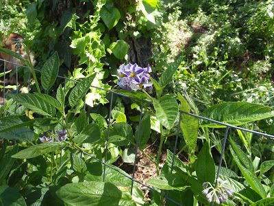 This plant, somewhere between a vine and bush, gets pretty bluish flowers which become tasty/refreshing little mini melon/cucumberish fruits – but I don’t know what they are!  Scrumptious though, I’m guessing in the cucumber family.