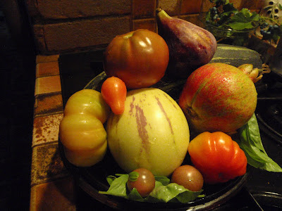 Today was a phenominal harvest, so beautiful, so bountiful, a gift!!!  One plump fig, one huge zuccini, lovely tomatoes of different varieties, one mystery melon, a juicy orange, basil – basil – and – more – basil, and….my first pomegranite!!!!  See below for a photo of today’s harvest – doesn’t this photo look like a still life?