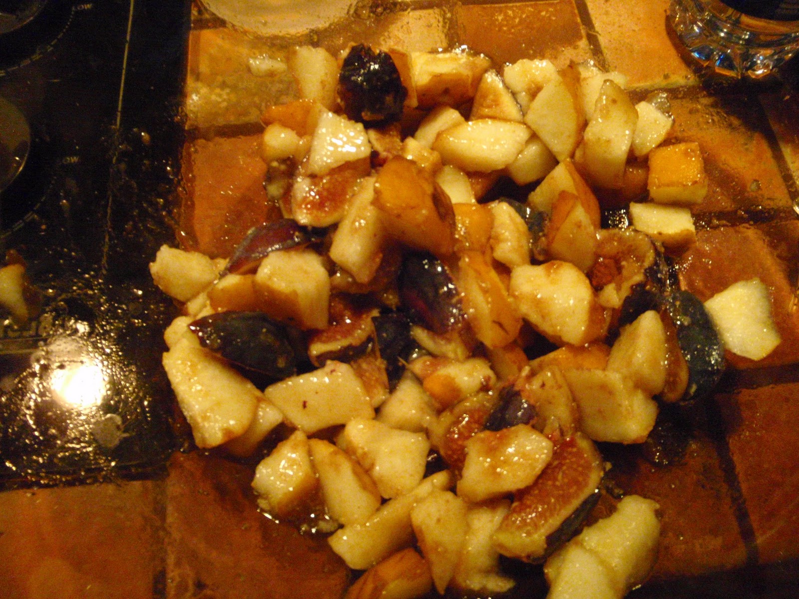 1.  Figgy Pear Perfection:  I took 3 very ripe pears from the fridge, and diced them, leaving the skin on.  I tossed these pears with a bit of brown sugar (doesn’t brown sugar make everything yummie?), and a healthy dose of cinammon.  Then I diced in the figs, tossed and let it sit for a bit, then added the super juicy orange torn into tiny bits, without skin of course, and let it marinate.  Take the chunks of luscious fruit out of the bowl that it is marinating in, and transfer to fun serving ware – I like to use martini glasses or other fun stemware.  KEEP THE BOWL with the remaining fruit sauce on it – we will use the bowl with sauce to flavor the sweet potato dish below.  Here is the photo of the Figgy Pear Perfection as it marinates: