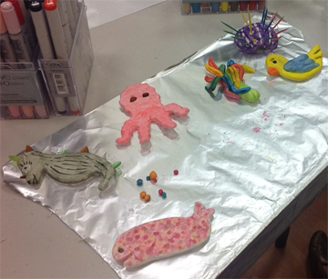 Last night’s Creativity Central was filled with wonderfully whimsical colors and also real treasure – the “treasure” are the happy smiles we all shared. -But we can’t minimize the great work! Carol’s beautiful sculptures from last week, like the mermaid and the sea kelp, along with Allyson’s fearless creativity (not to mention her toothpick prickly sea urchin) and Joannie’s brilliant technique and eye for color, made this an extra special Creativity Central, and the wonderful underwater adventure we are creating is going to be truly spectacular and fun. I am so proud of this team – and they are a beautiful team. For example, Carol’s impressive mermaid that Carol had so lovingly sculpted was colored beautifully by Joannie, and we all shared different elements of what we worked on with each other, getting the most of the group’s collective creativity. Here are some photos from this especially talented group: